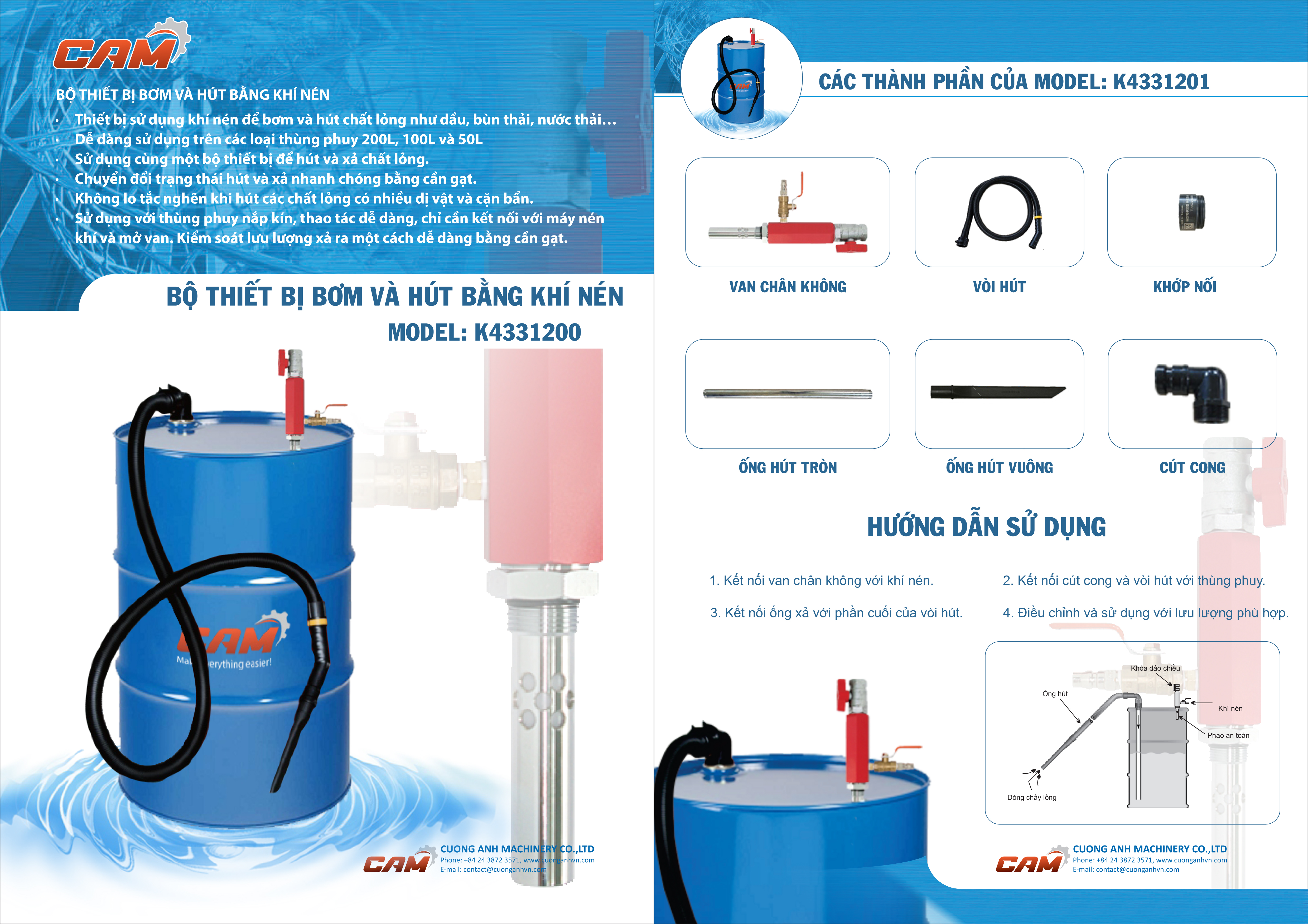 - Sử dụng với thùng phuy nắp kín, thao tác dễ dàng, chỉ cần kết nối với máy nén khi và mở van. Kiểm soát lưu lượng xả ra một cách dễ dàng bằng cần gạt.